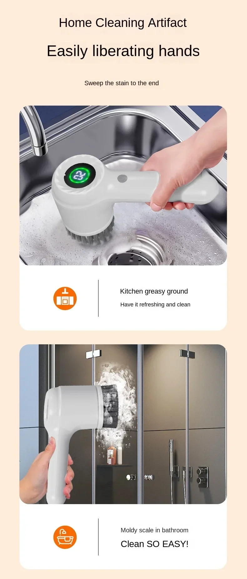Multiple brush heads, one step disassembly and assembly. Powerful enough to handle heavy oil stains